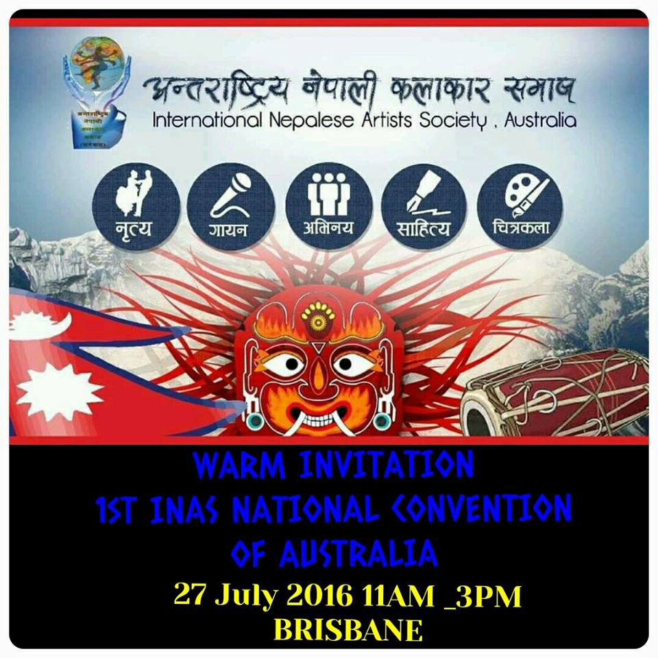 २ जुलाई २०१६, एडिलेड (मिलन दाहाल)- अन्तराष्ट्रिय नेपाली कलाकार समाज (इनास) अष्ट्रेलियाको क्षेत्रिय सम्मेलन अष्ट्रेलियाको ब्रिसबेनमा आगामी २७ जुलाईमा हुने तय भएको छ । कार्यक्रम बिहान ११ बजेबाट अपह्रान्नको ३ बजेसम्म हुने बताइएको छ । कार्यक्रमको मुख्य उदेश्य इनास अष्ट्रेलियाका राज्य कमिटिका सदस्यहरुबिच परिचय तथा कार्यपत्रको प्रस्तुतिका साथै इनासको अष्ट्रेलिया घोषणापत्र जारी गर्नु रहनेछ । सम्मेलनमा सबै राज्य कमिटिहरुबाट कार्यपत्र प्रस्तुत हुनेछ भने उक्त कार्यपत्रमाथी छलफलपनि हुनेछ ।